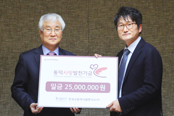 한국고분자시험연구소(주) 박기홍 소장은 “연구소에 실습하러 온 동덕여대 학생들이 매우 훌륭하게 역할을 수행하고 있다. 이런 학생들에게 작게나마 도움이 되고자 발전기금을 기부하게 되었다”고 기부의 뜻을 밝혔다.