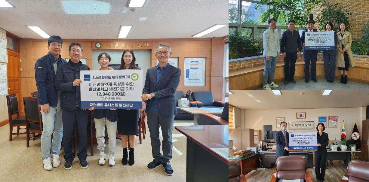 유니스트 발전재단(이사장: 이용훈)은 유니스트의 비전을 공유하는 사회공헌활동의 일환으로 11월 부울경 지역 과학고(울산과학고, 부산일과학고, 경남과학고)에 총 700만원 상당의 발전기금을 기탁하고 발전기금 전달식을 진행하였다. 이는 미래과학인재 육성을 위한 교육활동 목적으로 사용될 예정이다.